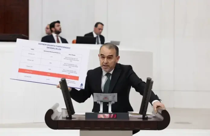 “Bugün deprem bölgesinde devam eden birçok sorundan sadece iki başlığı sizlerle paylaşmak istiyorum. Bunlardan birincisi Doğal Afet Sigortaları Kurumu kısa adıyla DASK’ın 6 Şubat 2023 depremi sonrasında sigorta kapsamında ödemesi gereken tazminatların sadece yarısını ödemesidir. 6 Şubat depreminden 73 gün önce 25 Kasım 2022 tarihinde betonarme binaların metrekare tazminat bedeli 1508 TL’den 3016 TL’ye çıkarılmıştır. Bu tebliğ yayımlandığı gün olan 25 Kasım 2022 tarihinde yürürlüğe girmiştir. Ancak DASK, depremzedelere ödediği tazminat bedelini metrekare için 3016 TL değil 1508 TL’den hesaplamıştır. Gördüğünüz bu tabloda 2019 ile 2023 arasında 5 tarife yayımlanmıştır. Bu beş tarifenin dördünde ‘Mevcut sigortalılar ilave prim ödemeden yeni tarifeden istifade eder’ cümlesi tebliğnameye eklenmiştir. Tabloda görünüyor. Sadece 25 Kasım 2022 günlü tarife ilanında bu cümle konulmamıştır. Onun için tabloda kırmızı olarak yer almıştır. DASK, tebliğde bu cümlenin yer almaması nedeniyle yeni tarifeden ödeme yapmayacağını ifade etmekte ve o tarihte sigortalılara SMS göndermek suretiyle ilave prim yatırmalarını aksi halde yeni tarifeyi uygulamayacağını duyurduğunu söylemektedir.”