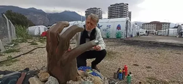 Depremlerde evi yıkılan İskenderunlu sanatçı ve ressam Erdoğan Akın, yıkıntıların arasında uzanan bir eli tuttuğu anları yaşadığı konteyner kentte yaptığı el heykeliyle ölümsüzleştirdi. Akın, kaldığı konteyneri de renk renk boyadı.