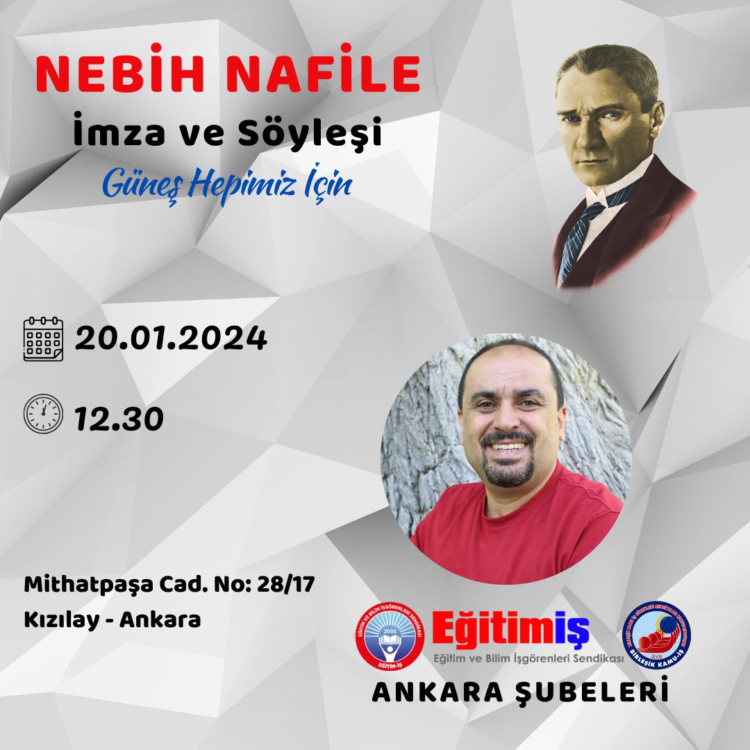 Eğitim İş, Eğitim ve Bilim İşgörenleri Sendikası Ankara Şubelerinin organize ettiği “Kitap İmza ve Söyleşisi” 20 Ocak 2024 cumartesi günü Ankara Kızılay Mithatpaşa Caddesi 1 Nolu şubede saat 12.30’da gerçekleştirilecektir.