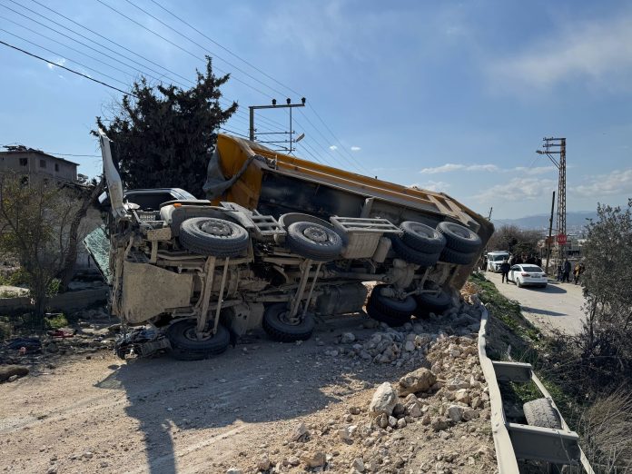 Hatay’da sürücüsünün kontrolünden çıkarak devrilen hafriyat kamyonunun sürücüsü yaralandı.
