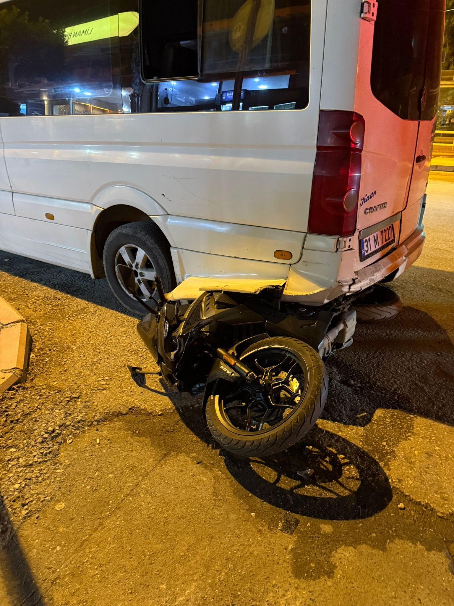 Hatay’da kontrolden çıkıp devrilen motosiklet sürüklenerek park halindeki minibüsün altına girdi. O anlar güvenlik kamerasına yansıdı.
