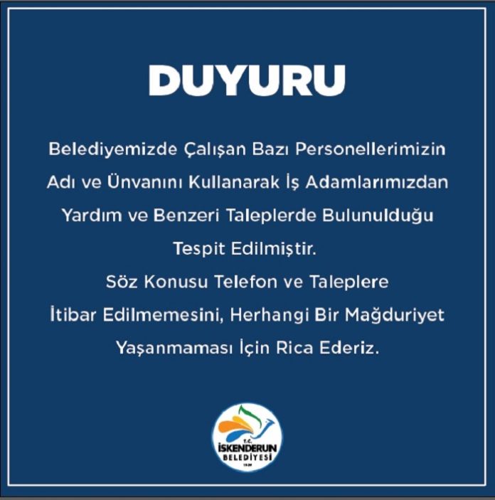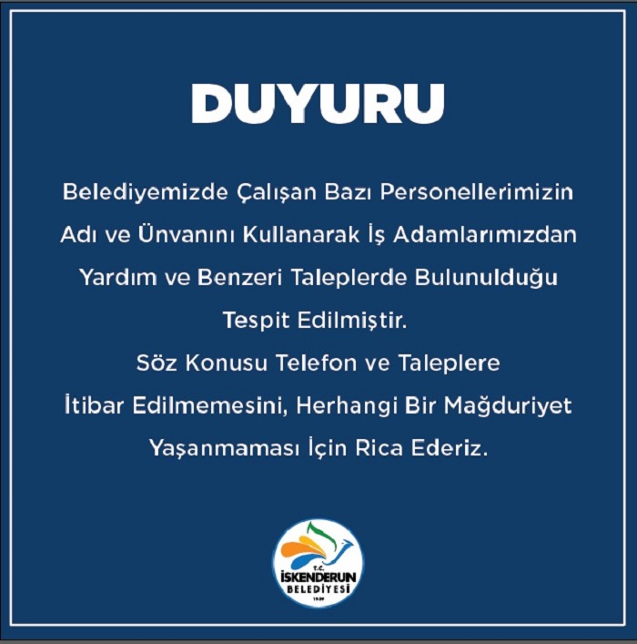 İskenderun belediyesinden yapılan açıklamada; İskenderun belediyesinin böyle bir talebi olmadığı ve olmayacağı belirtilerek, para talebinde bulunulan vatandaşların dikkatli olmaları istendi.
