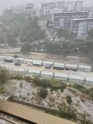 Belen ve Arsuz ilçelerinde etkili olan dolu yağışı çevreyi beyaza bürüdü.