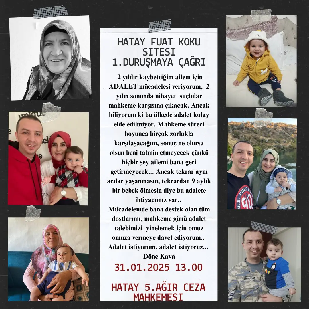 6 Şubat depremlerinde Hatay’da, Fuat Koku Sitesi’nde ailesini kaybeden Döne Kaya, adalet mücadelesini sürdürüyor. Kaya, kayıplarının ardından geçen sürede hukuk mücadelesini bırakmayarak, sonunda suçluların mahkeme karşısına çıkacağını duyurdu.