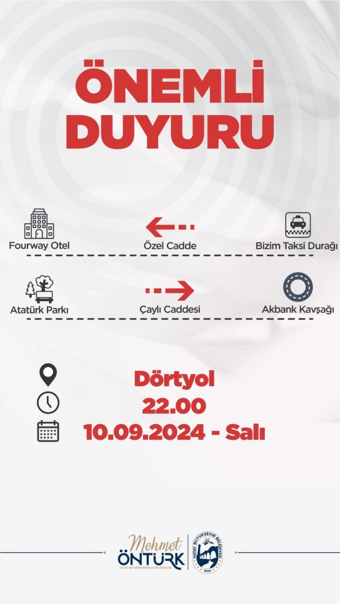 Büyükşehir tarafından yapılan açıklamada Dörtyol ilçesindeki yeni düzenlemelere göre, trafik akışının Özel Caddesi’nde, Bizim Taksi Durağı’ndan Fourway Otel yönüne; Çaylı Caddesi’nde ise Atatürk Parkı’ndan Akbank Kavşağı güzergahına doğru olacağı bilgisi paylaşıldı.