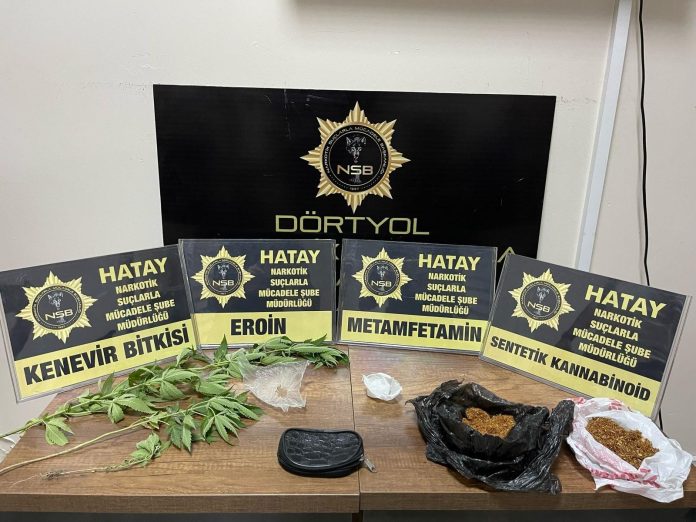 Hatay Emniyet Müdürlüğü görevlilerince uyuşturucu imal ve ticaretine yönelik yürütülen çalışmada Dörtyol ilçesinde H.Ç. isimli şahsın Numune Evler Mahallesi’ndeki ikametinde arama gerçekleştirdi. Yapılan aramada 7,13 gram metamfetamin, 2 parça halinde toplam 58,56 gram sentetik kannabinoid, 1,70 gram eroin ve boyları 20 ile 75 santimetre arasında değişen 3 kök kenevir ele geçirildi.
