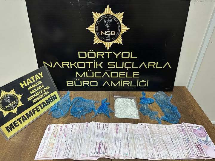Dörtyol Cumhuriyet Başsavcılığınca yürütülen soruşturma kapsamında, Narkotik Suçlarla Mücadele Büro Amirliği görevlilerince, 22.08.2025 tarihinde Dörtyol ilçesi Yeşilköy Mahallesi’nde yürütülen saha çalışmalarında tespiti yapılan A. A. isimli şahıstan 78,14 gram metamfetamin uyuşturucu maddesi ve suçtan elde edildiği değerlendirilen 56.000 TL nakit para ele geçirilmiş olayla ilgili şüpheli A.A. isimli şahıs Savcılık talimatıyla gözaltına alınmıştır