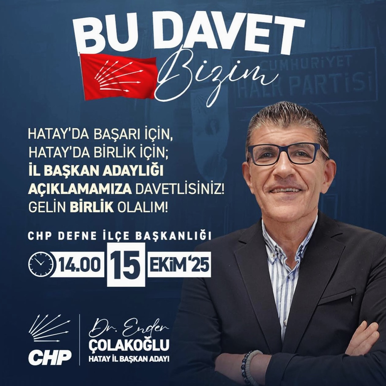 İl Başkan Adaylığı için basın açıklamasını 15 Ekim 2025 Çarşamba günü saat 14.00’da Defne İlçe Başkanlığında gerçekleştireceğini duyuran Çolakoğlu; “CHP’yi iktidara taşımak için omuz omuza çalıştığımız ve çalışacağımız tüm yol arkadaşlarımı, 15 Ekim’de Defne İlçe Başkanlığına bekliyorum. Hatay’da Başarı İçin, Hatay’da Birlik İçin; İl Başkan Adaylığı Açıklamamıza Davetlisiniz! Gelin Birlik Olalım! Kurtuluş yok tek başına! Ya hep beraber, Ya hiçbirimiz…” diyerek tüm partilileri basın açıklamasına davet ett