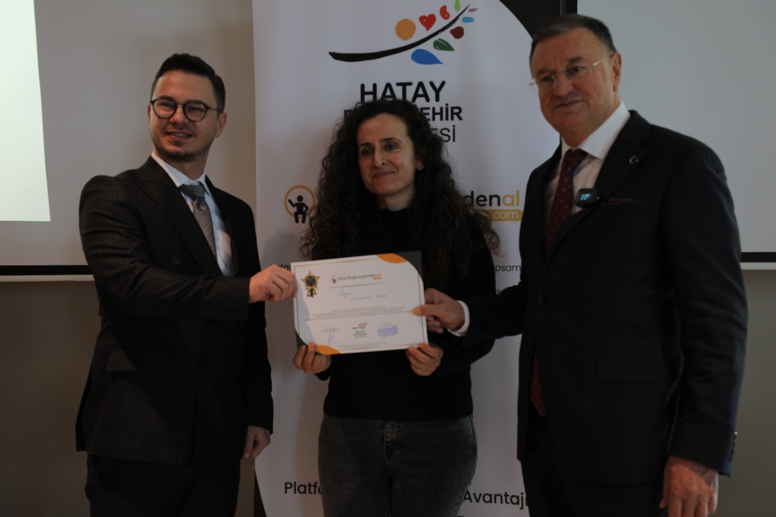Çelik, Hatay’ depremden bu yana terk etmeyerek sahalarda olan ve proje için çok önemli çalışmalar gerçekleştiren HBB Başkanı Doç. Dr. Lütfü Savaş’a plaket verdi.