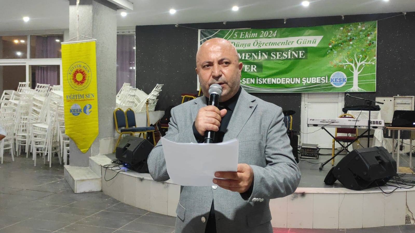 Gecenin açılış konuşmasını Eğitim-Sen İskenderun Şube Başkanı Mustafa Ünsal yaptı. Konuşmasına 5 Ekim’in tarihini anlatarak başlayan Ünsal, bu yıl 5 Ekim kutlamalarının, Eğitim Enternasyonali tarafından “Öğretmenin Sesine Değer Ver” şiarıyla kutlandığını söyledi.