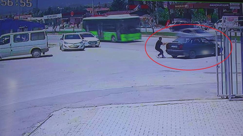 Kaza, Antakya ilçesi Habibi Neccar kavşağında yaşandı. Bölgede bulunan akaryakıt istasyonuna aracın park eden sürücü, el frenini çekmeyi unuttu. Sürücünün markette olduğu esnada hareket etmeye başlayan otomobil, hızla yola doğru çıktı. Anbean kameraya yansıyan olayda otomobil, seyir halindeki halk otobüsüyle çarpıştı. El freninin çekilmediği otomobilin ana yola gittiği ve sürücüsünün aracını yakalamaya çalıştığı o anlar saniye saniye güvenlik kamerasına yansıdı. Kazada yaralanan olmazken otomobilde ve otobüste maddi hasar oluştu.