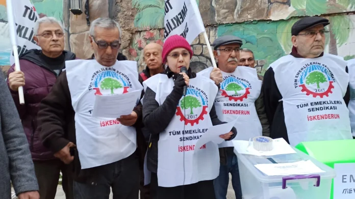 Tüm Emekliler Sendikası İskenderun Temsilciliği, üyeleriyle birlikte Şehit Pamir Caddesi Havuzlu Çarşı girişinde basın açıklaması yaptı. Açıklamayı sendikanın İskenderun Temsilcisi Medine Yayman “Emekliye Kaynak Yok, Saraya Var” diyerek iktidarı eleştirdi.