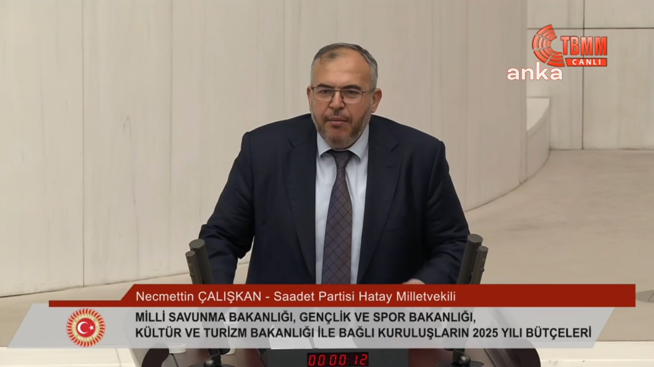 TBMM Genel Kurulu’nda Milli Savunma Bakanlığı, Gençlik ve Spor Bakanlığı ile Kültür ve Turizm Bakanlığı’nın 2025 yılı bütçeleri görüşülüyor. Saadet Partisi Hatay Milletvekili Necmettin Çalışkan, konuşmasında şunları söyledi: