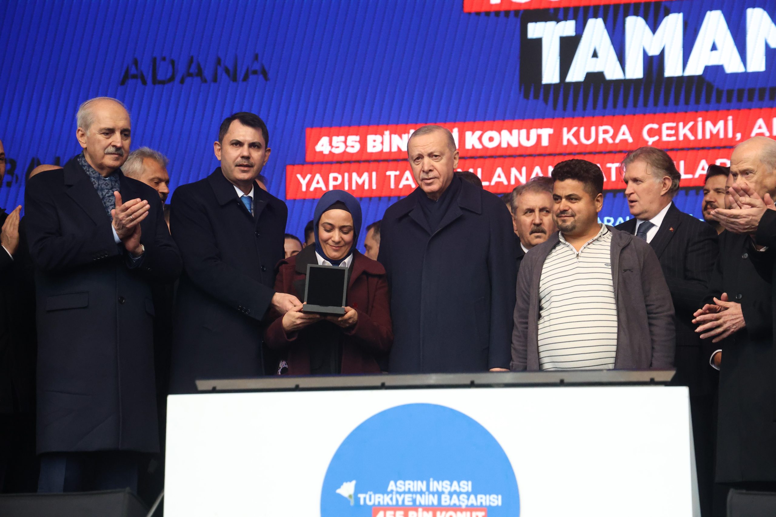 Cumhurbaşkanı Recep Tayyip Erdoğan 455 bininci konutu teslim etmenin gururunu yaşadıklarını ifade ederek, “İşte bugün dünyada hemen hiçbir ülkenin altından kalkamayacağı büyük bir başarıya Hatay’ımızda bizzat tanıklık ediyoruz. Depremin vurduğu on bir ilimizde yapımı tamamlanan 455 bininci afet konutumuzu hak sahibi kardeşlerimize teslim etmenin gururunu yaşıyoruz. Bu yuvalarda yepyeni bir hayatın sayfasını açacak tüm vatandaşlarımıza hayırlı, uğurlu olsun diyor, hanelerine kavuşan her bir kardeşime sağlıklı, mutlu, bereketli ömürler diliyorum. Rabb’im bu evlerde inşallah ağız tadıyla oturmayı nasip eylesin” şeklinde konuştu.
