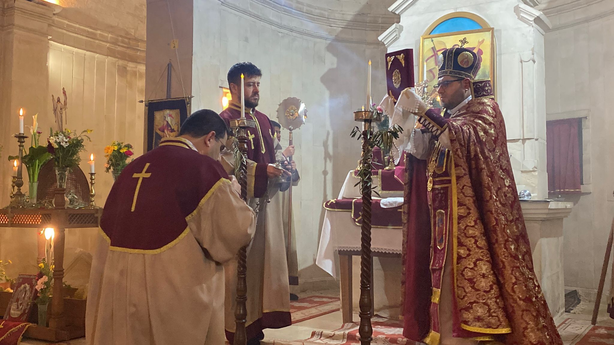 Ayin sırasında kilisenin ışıklarının söndürülmesiyle Peder Tabaşyan’ın elindeki mumdan, mumlarını yakan cemaat karanlığı aydınlatırken, ilahiler eşliğinde kilise bahçesine geçildi. Peder Tabaşyan, kilise bahçesinde ilahiler eşliğinde ekmek, yumurta, su ve tuzu kutsadı.