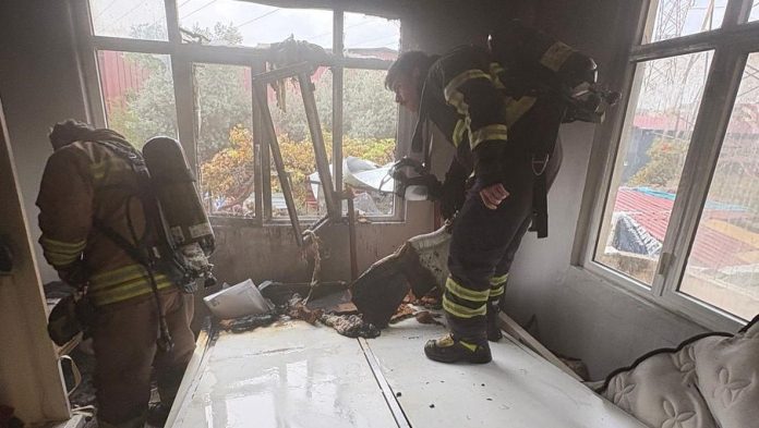 İtfaiye ekipleri tarafından yangın söndürülürken evde maddi hasar oluştu