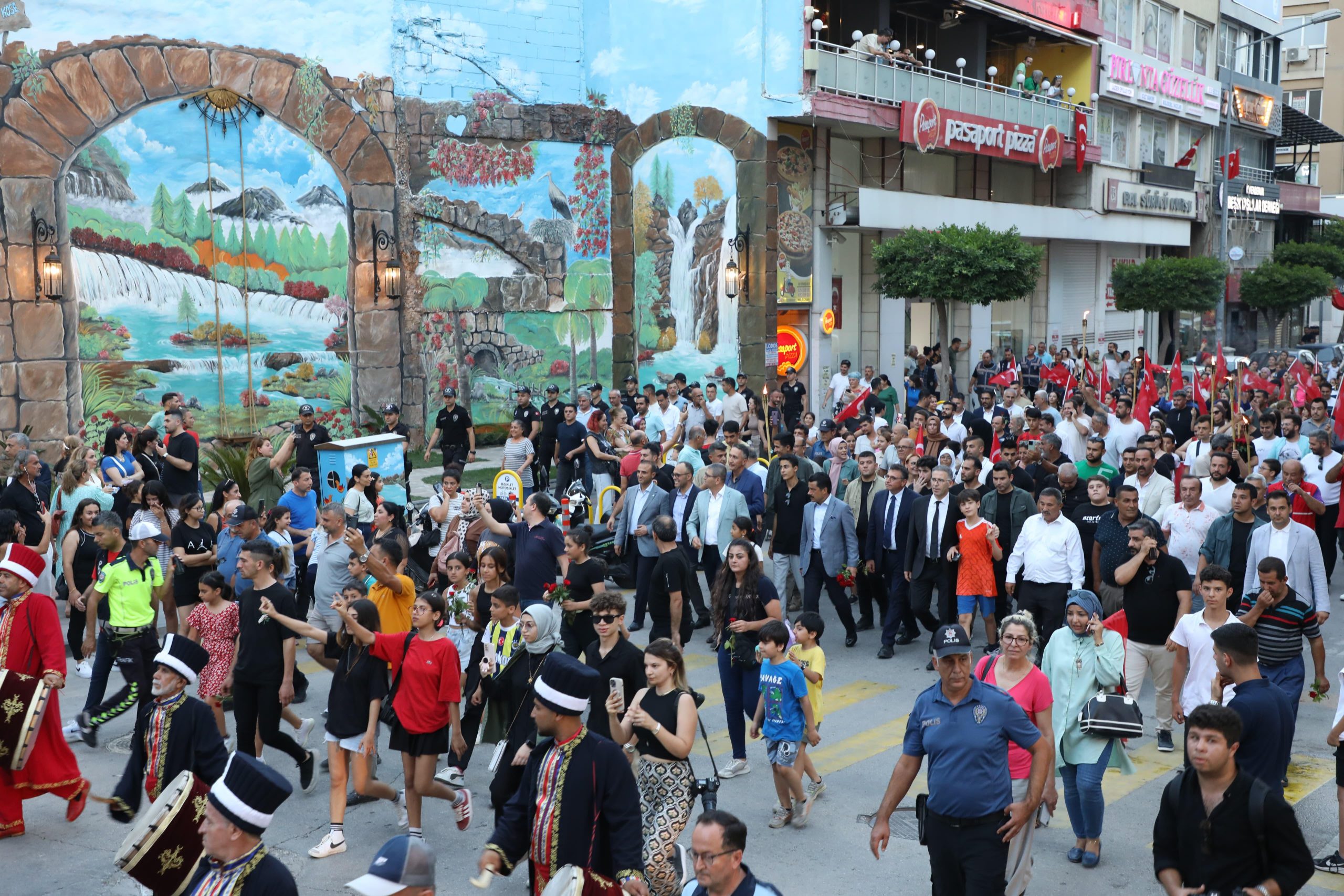 Kutlamalar kapsamında düzenlenen “Zafer Yürüyüşü”, mehteran eşliğinde meşalelerle Ulucami Caddesi’nde başladı. Anıt Alanı’nda son bulan yürüyüşe katılanlara çevredeki vatandaşlar da alkışlarla destek verdi.