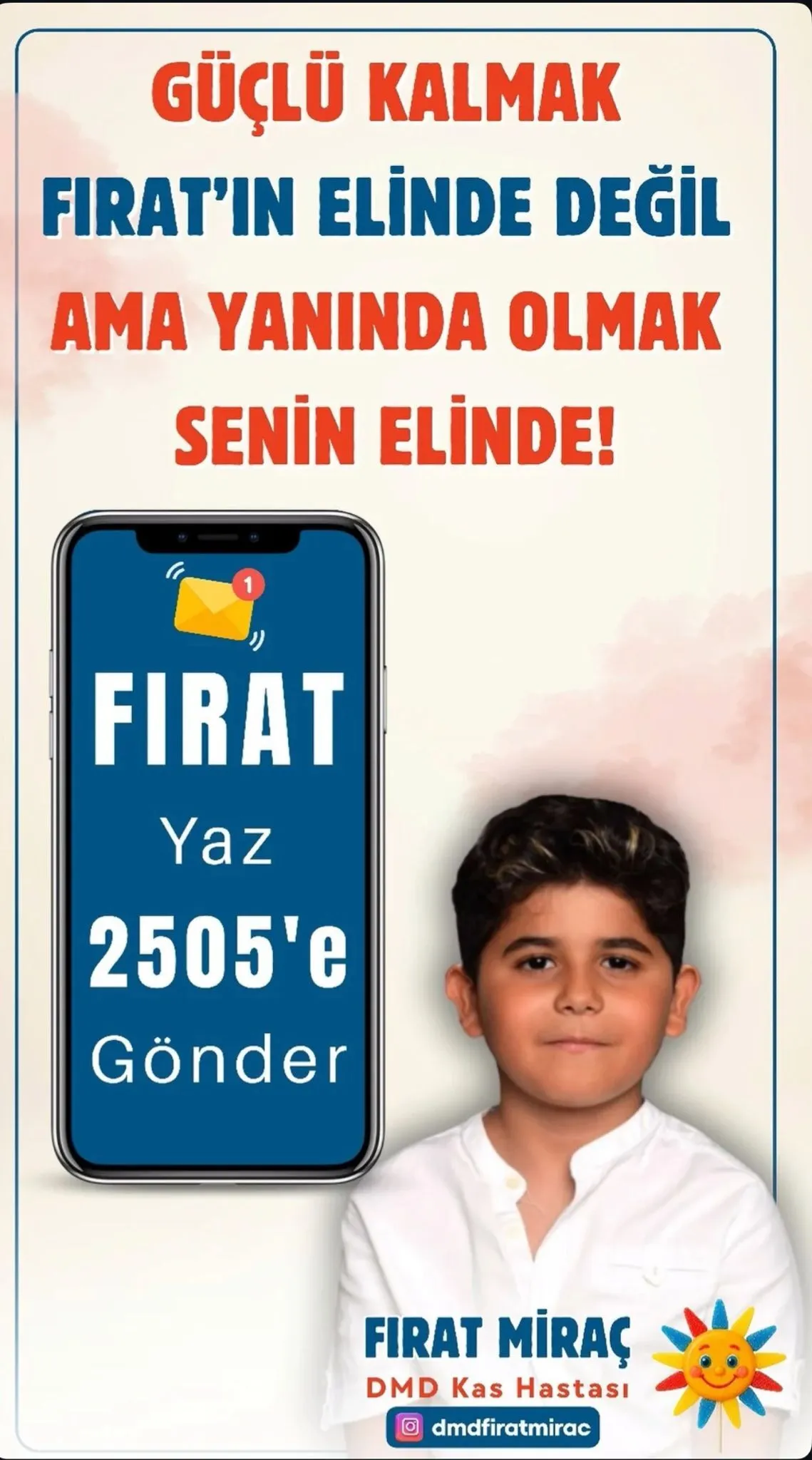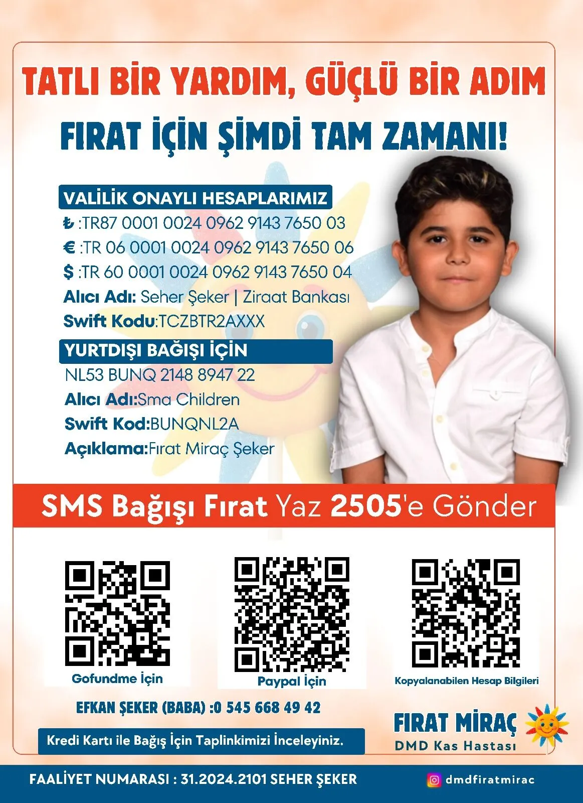 8 yaşındaki DMD hastası Fırat Miraç Şeker de kendisini yardım edilmesini ve yaşıtları gibi koşup oynamak istediğini belirterek, hayata tutunma arzusunu ortaya koydu. Fırat Miraç’ın tedaviye ulaşması için kampanyaya verilecek her destek büyük önem taşıyor. Zamanla yarışan Şeker ailesi, Fırat’ın sağlığına kavuşması için umutla bekliyor.