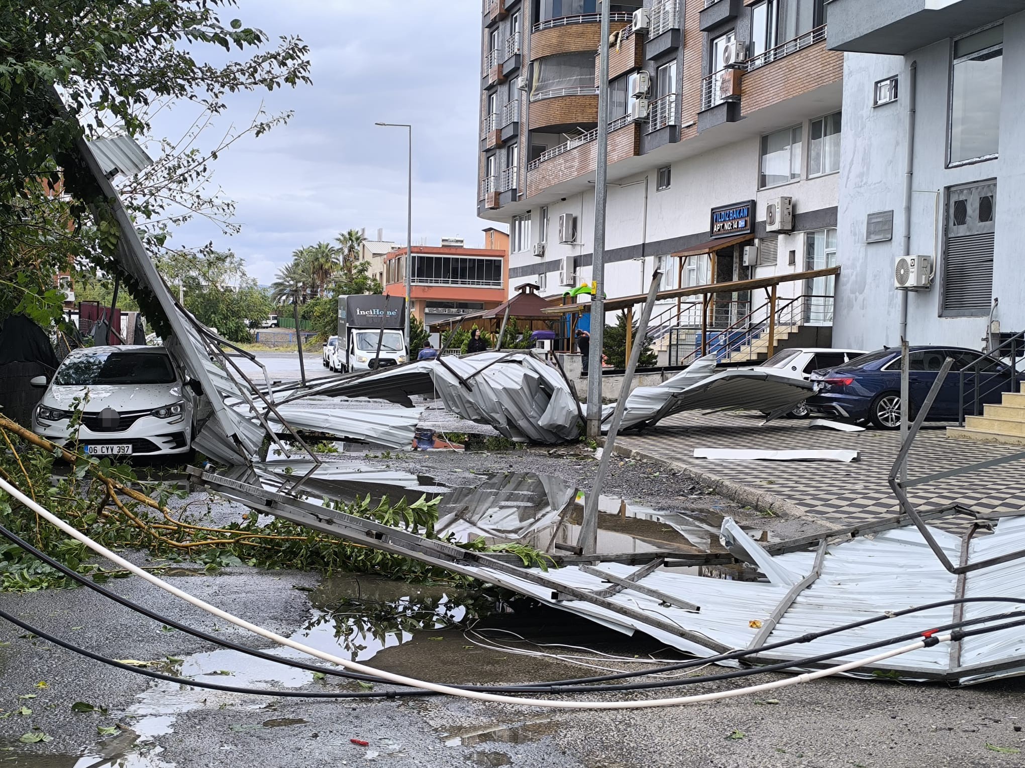 Meteorolojinin yağış ve fırtına uyarısında bulunduğu Hatay’da geçtiğimiz gün sabah saatlerinden itibaren yağış etkili olmaya başladı ve gece saatlerine kadar sürdü. Kentin kıyı ilçelerinden Dörtyol ilçesinde yağışla birlikte kuvvetli fırtına etkili oldu. Fırtınada ilçedeki Süleyman Demirel Anadolu Lisesi okulunun çatısından uçan kiremit ve beton parçaları, park halindeki araçlara zarar verirken o anlar kameraya yansıdı. Öte yandan, ilçedeki bir binanın çatısının uçtuğu anlar ve Dörtyol Numuneevler Mahallesi’nde belediyeye ait konteyner ekmek büfesinin kuvvetli fırtınada devrildiği anlar kameraya yansıdı.