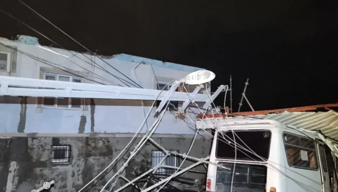 Fırtınanın etkisiyle bir binanın çatısı yerinden koparak elektrik direğinin üzerine düştü, kesintilere neden oldu.