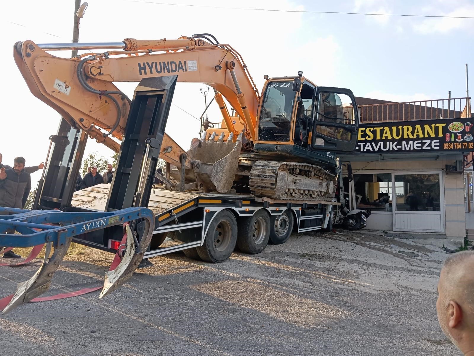 Freni patlayarak sürücüsünün kontrolünden çıkan iş makinası yüklü tır, iş yerine daldı. Kazada araçta sıkışan tır sürücüsünü itfaiye ekipleri kurtardı.