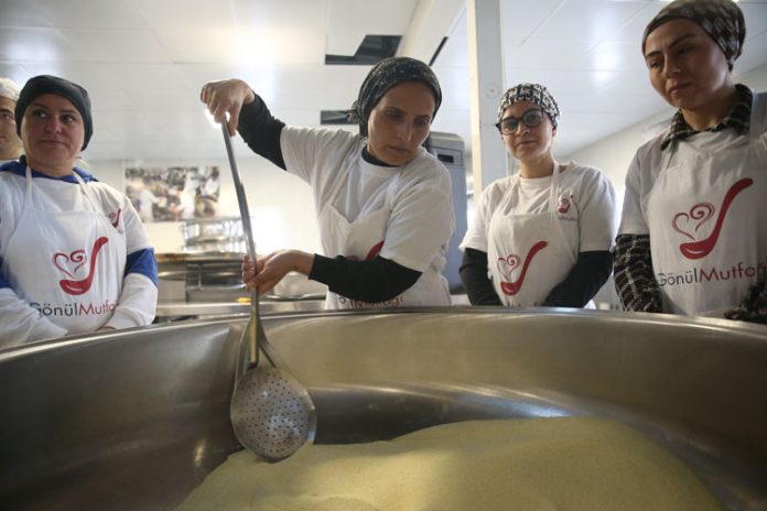 İskenderun’da depremlerin ardından gönüllülerin katılımıyla kurulan “Gönül Mutfağı”nda, afetin ikinci yılı dolayısıyla helva kavruldu.