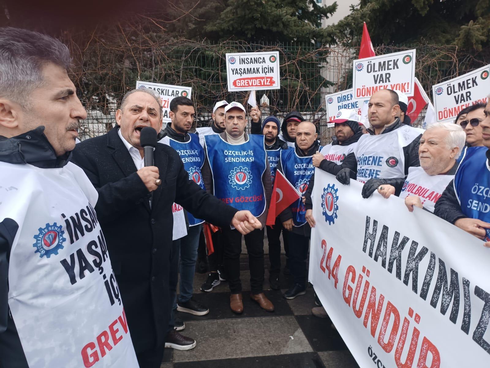 244 gündür açlık ve sefalete mahkum edilen işçileri Çalışma Bakanlığı önüne getirdiklerini ifade eden Genel Başkan Değirmenci, “Çalışma Bakanlığı bizim güvencemiz, devletimizin temsilci ve onlardan yardım isteyeceğiz. Kural ve kanun tanımaz, emeğe saygısı olmayan, ne yaptığını bilmeyen bir işveren anlayışına karşı Çalışma Bakanımızdan ve çalışma arkadaşlarından bu acımasız tavra karşı, destek isteyeceğiz. “ şeklinde açıklamada bulundu.