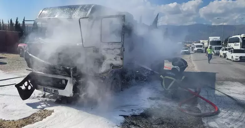 Antakya İlçesinde hafriyat yüklü kamyonda bilinmeyen bir nedenle yangın çıktı.