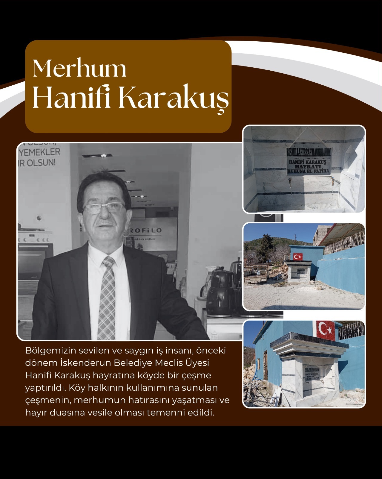Yaşamında hayırsever ve çalışkan bir insan olan merhum Hanifi Karakuş’un ailesi Babalarının hayır kapısının kapanmaması için çok hayırlı bir işe imza attılar. Merhum Hanifi Karakuş’un memleketi Hatay’ın Yayladağı ilçesi Yeditepe (Bezge) Mahallesinde Mezarlık önünde bulunan ve ‘Hanifi Karakuş Hayratı’ olarak adının verildiği çeşmenin bakım, onarımı ailesi tarafından titiz bir çalışma ile yaptırıldı. Karakuş ailesi örnek bir hayır işinde bulunarak, tadilatının yanı sıra çeşmeyi mermerle kaplattılar ve hayırlı bir Sadaka-i Cariye olarak halkın en önemli su ihtiyacını karşıladılar. Vatandaşlar, Merhum Hanifi Karakuş’un ailesine yaptıkları hayırlarından dolayı teşekkür ettiler ve merhum Hanifi karakuş’un ruhuna Fatihalar okudular.