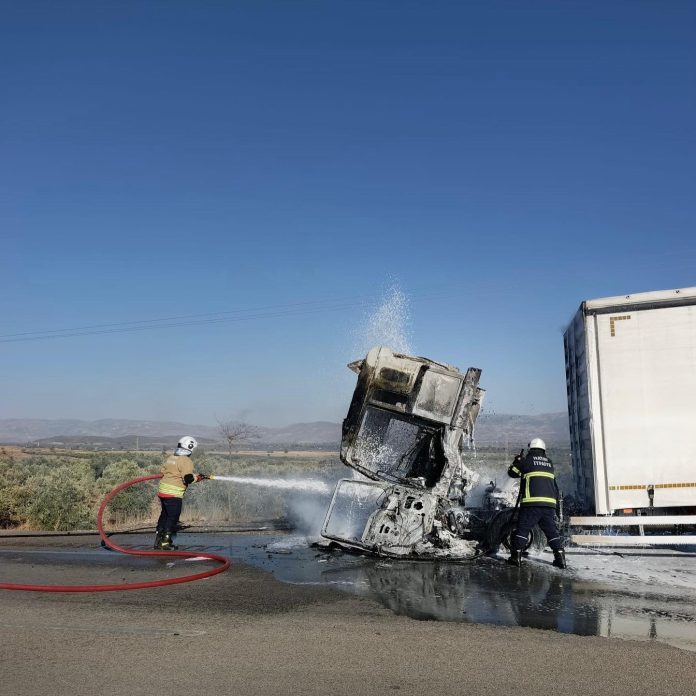 HATAY (İHA) – Hatay’da seyir halindeyken alevlere teslim olan tır, yanarak kullanılmaz hale geldi.