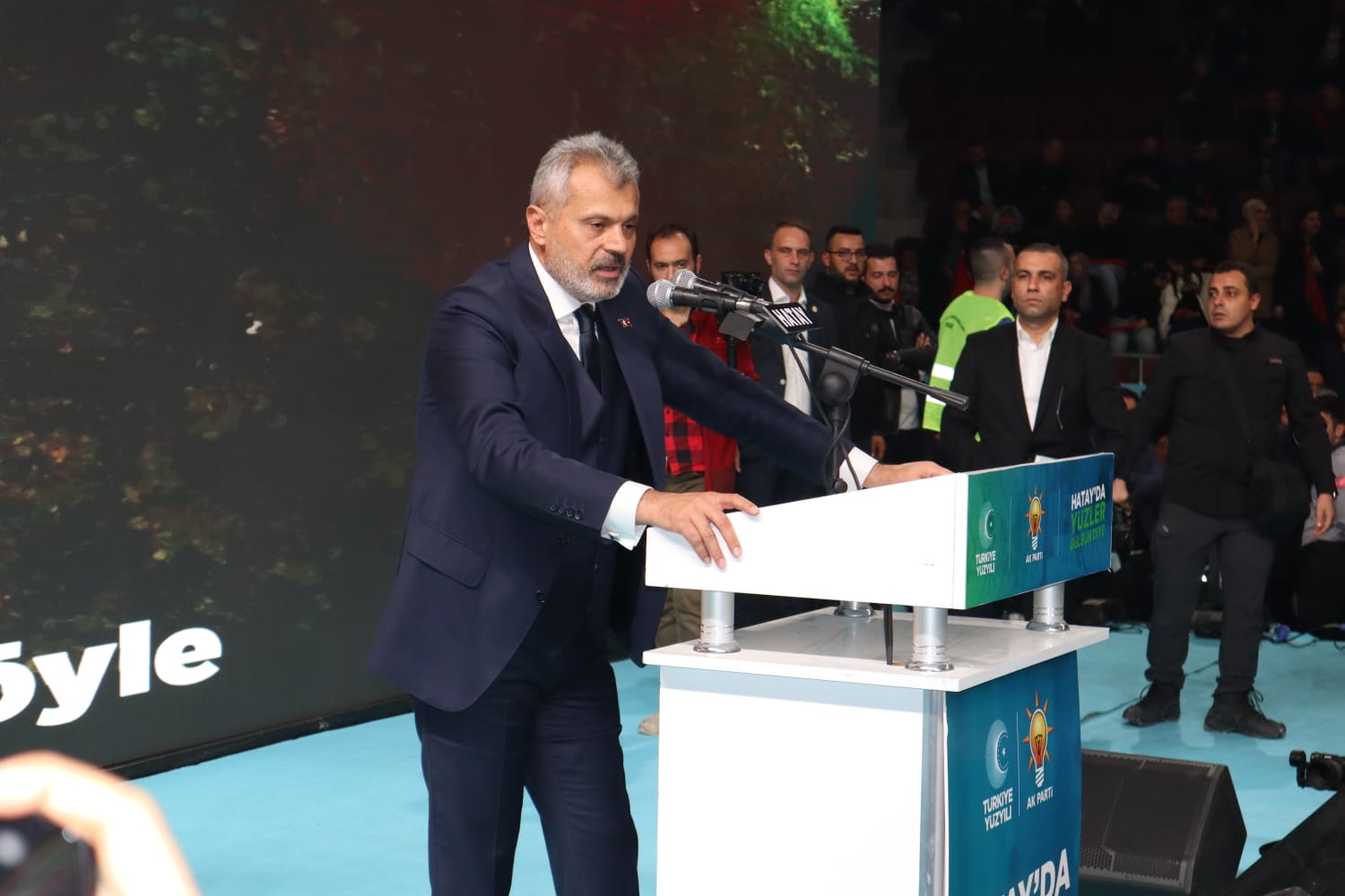 Kürsüye coşkulu kalabalığın sloganları ile çıkan Hatay Büyükşehir Belediye Başkan adayı Mehmet Öntürk ” Hatay’ın altın yürekli insanları hoşgeldiniz. Şöyle bir baktığımda umudunuzu gördüğümde iyi ki burdayım diyorum. Evimiz Hatay. Öyle bir ev ki Hatay başkalarının farklılık tanımlandığını o kardeşlik olarak tanımlar. Oyle bir Hatay ki büyük lider Atatürkun şahsi meselesidir Hatay. Bizimde meselemiz Hatay. 6 Şubat’ta bizleri derinden sarsan felaket yaşadık. Binlerce canımızı yitirdik . Bizim için asrın acisiydi. Kelimlerle anlatamayız. Evet 6 Şubat’ta kıyameti yaşadık ama 31 Mart’ta
