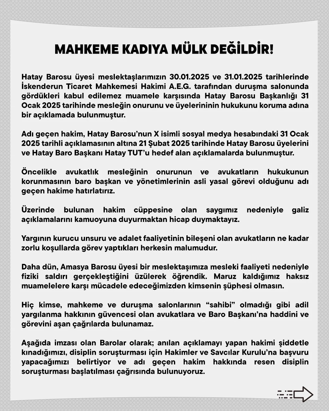 Olayın ardından Hatay Barosu, “Mahkeme Kadıya Mülk Değildir!” başlıklı bir açıklama yaparak, avukatlara yönelik kabul edilemez tutum karşısında sessiz kalmayacaklarını duyurdu. Açıklamada şu ifadelere yer verildi: