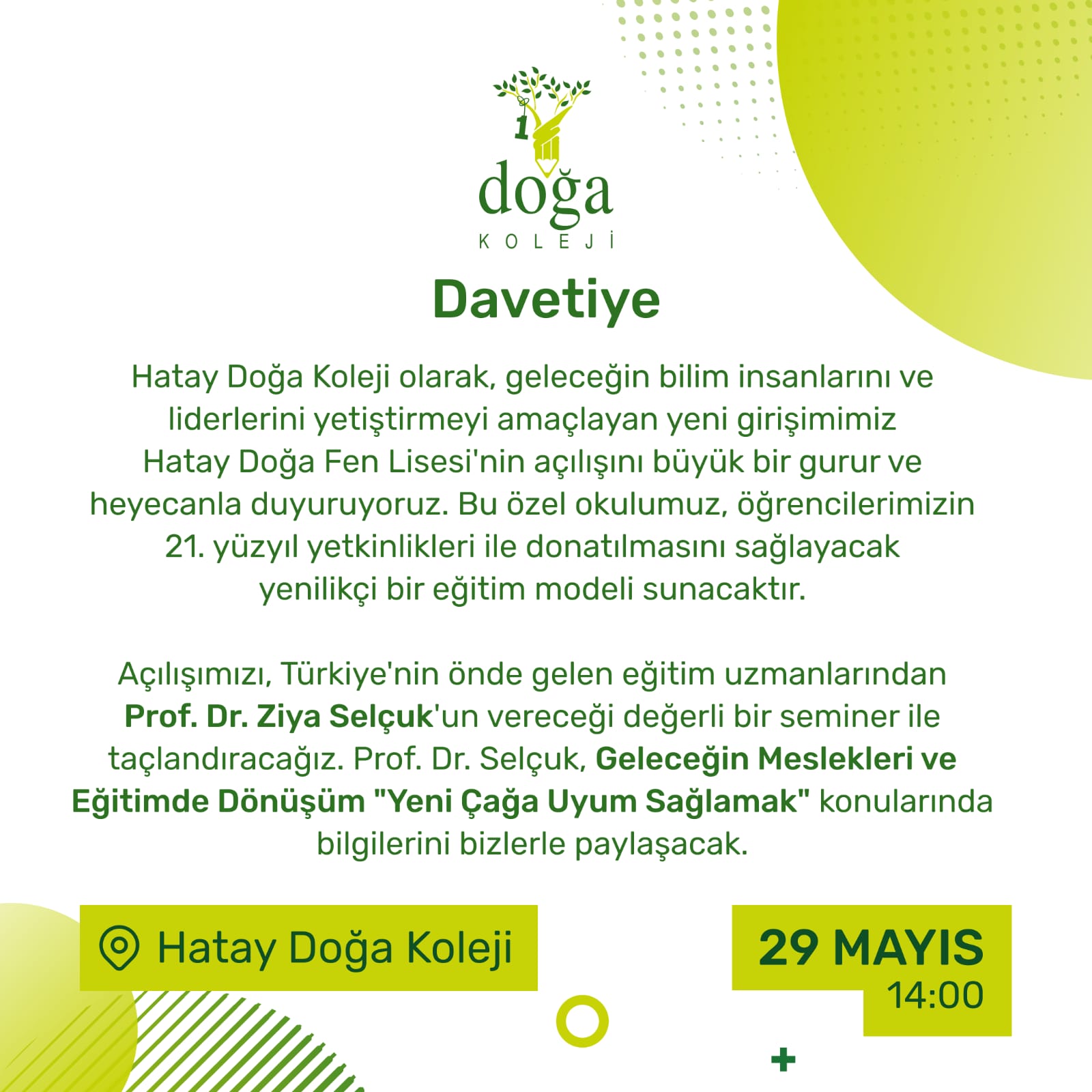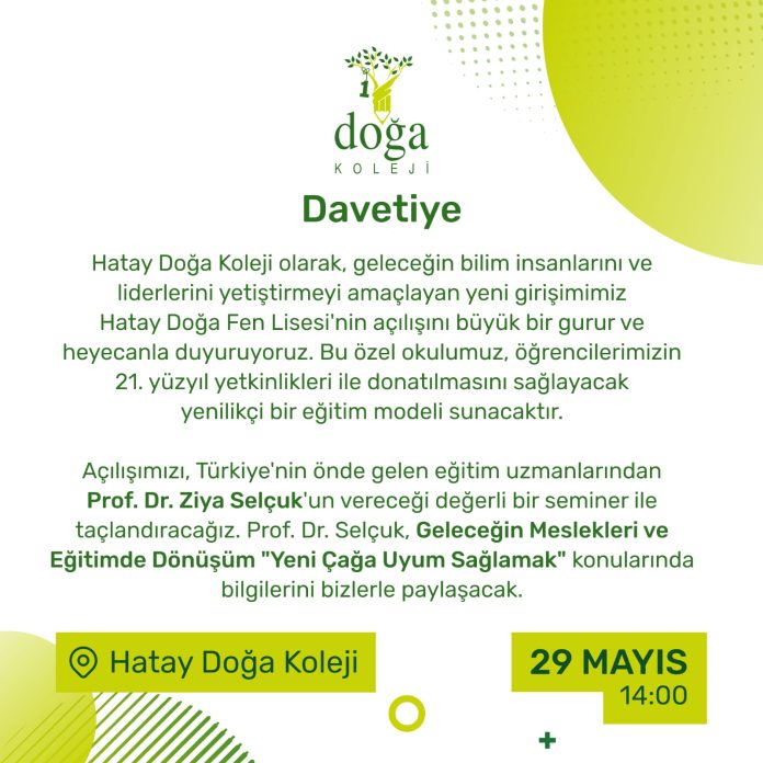 Hatay Doğa Koleji yetkilileri, açılışın büyük bir gurur ve heyecanla kutlanacağını belirtirken, Prof. Dr. Ziya Selçuk’un değerli katkılarıyla açılışlarını taçlandıracaklarını ifade etti. –