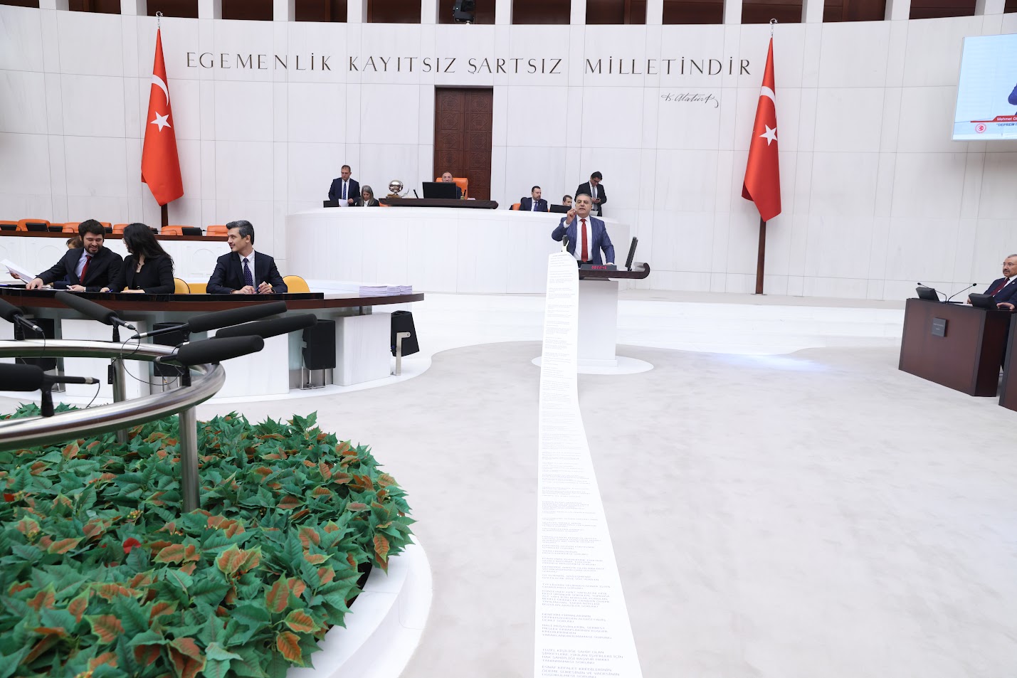 Hatay’ın en önemli sorunlarının yer aldığı 7,5 metrelik bir rulo açan Güzelmansur “Depremin üzerinden koskoca dört yüz yetmiş sekiz gün geçti ama Hatay insanlarının sorunları çözüleceğine sorunlar daha da artıyor. Bakın, bu, sorunların yumağı. 22 iki yıldır Hatay’ı hep ihmal ettiniz.” dedi.
