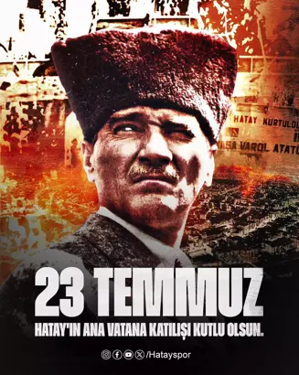 Hatayspor Kulübünden, Hatay’ın ana vatan topraklarına katılışının yıl dönümünü nedeniyle bir mesaj yayınladı. Kulübün paylaştığı kutlama mesajında, “Kırk asırlık Türk yurdu düşman elinde esir kalamaz. Hatay’ımızın ana vatana katılmasının 85’inci yıl dönümü kutlu olsun. Ulu Önderimiz Gazi Mustafa Kemal Atatürk’ü, aziz şehitlerimizi ve depremde hayatını kaybeden vatandaşlarımızı rahmetle anıyor, kahraman gazilerimize şükranlarımızı sunuyoruz” denildi.