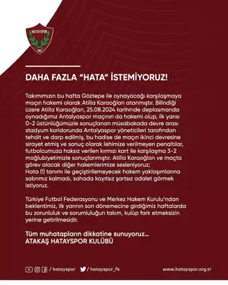 Hatayspor’da yönetim, sosyal medya üzerinden bir açıklama yayımlayarak, Göztepe maçına atanan hakem Atilla Karaoğlan’ın daha önce oynanan Antalyaspor maçında yaptığı hatalara dikkat çekti.