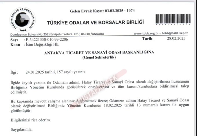 Antakya Ticaret ve Sanayi Odası‘nın adı Hatay Ticaret ve Sanayi Odası olarak değişti.
