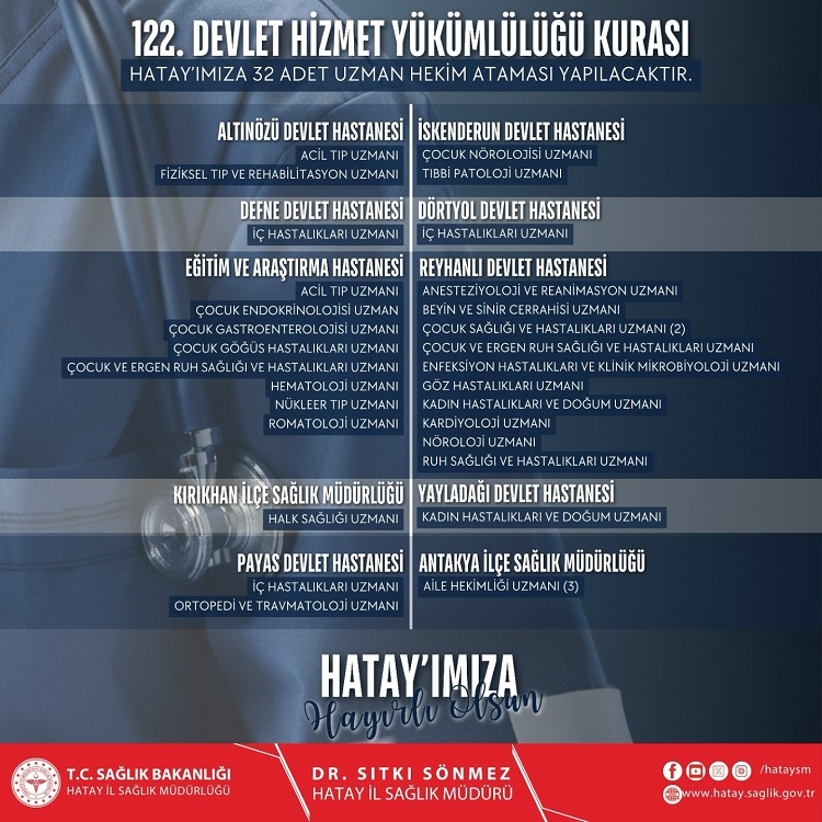 Hatay İl Sağlık Müdürlüğü’nden yapılan duyuruda, yeni atamalarla Hatay’ın daha güçlü bir sağlık kadrosuna kavuşacağını belirterek, “Sağlık Bakanlığı tarafından gerçekleştirilen 122. Dönem Devlet Hizmeti Yükümlülüğü kurası kapsamında ilimize; 32 uzman hekim ataması gerçekleştirilmiştir. Bu anlamlı ve değerli atamalar dolayısıyla başta Sağlık Bakanımız Sayın Prof. Dr. Kemal Memişoğlu olmak üzere emeği geçen tüm yetkililere teşekkür ederiz. İlimize hayırlı olsun. Her şey Hatay için, her şey halkımızın sağlığı için…” açıklaması yapıldı.