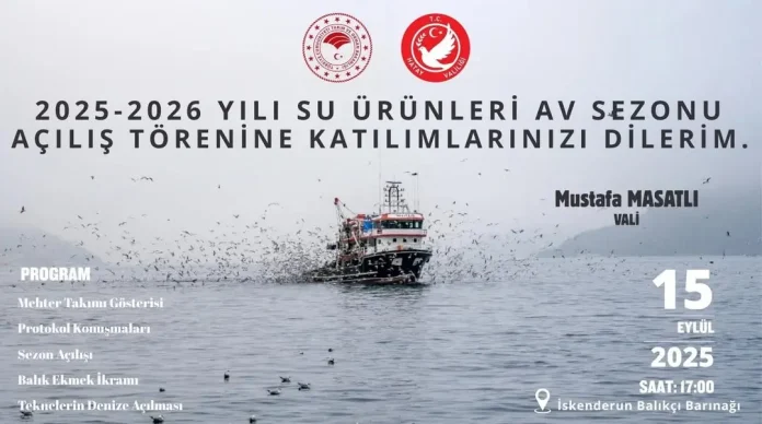 Hatay İl Tarım ve Orman Müdürlüğü, 2025-2026 Su Ürünleri Av Sezonu’nun açılış töreni hakkında bilgilendirmede bulundu. Tören, Vali Mustafa Masatlı’nın katılımıyla 15 Eylül 2025 Pazartesi günü saat 17.00’de İskenderun Balıkçı Barınağı’nda gerçekleştirilecek.