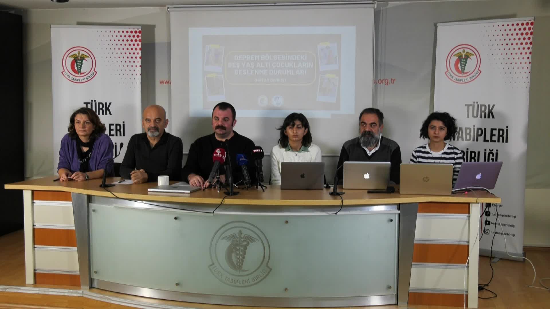 TTB ve SES, Ankara’da Hatay Deprem Koordinasyonu tarafından yürütülen malnütrisyon çalışmalarında tespit edilen gıda güvencesi ve 5-6 yaş altı çocukların beslenme sorunlarına ilişkin saha araştırmasının sonuçlarıyla ilgili basın toplantısı düzenledi. Toplantıya, TTB Merkez Yürütme Kurulu üyesi Dr. Ahmet Karer Yurttaş, SES Eş Genel Başkanı Nazan Karacabey, Halk Sağlığı Uzmanı, Prof. Dr. Mehmet Zencir, TTB Hatay Saha Sorumlusu Leyla Kalın, Diyetisyen Dicle Dilan Salman, Hatay Tabip Odası’ndan Dr. Sami Reyhan katıldı. TTB Başkanı Şebnem Fincancı Korur ve Çocuk Sağlığı ve Hastalıkları Uzmanı Prof. Dr. Münevver Kaynak Türkmen ise toplantıya online katıldı.