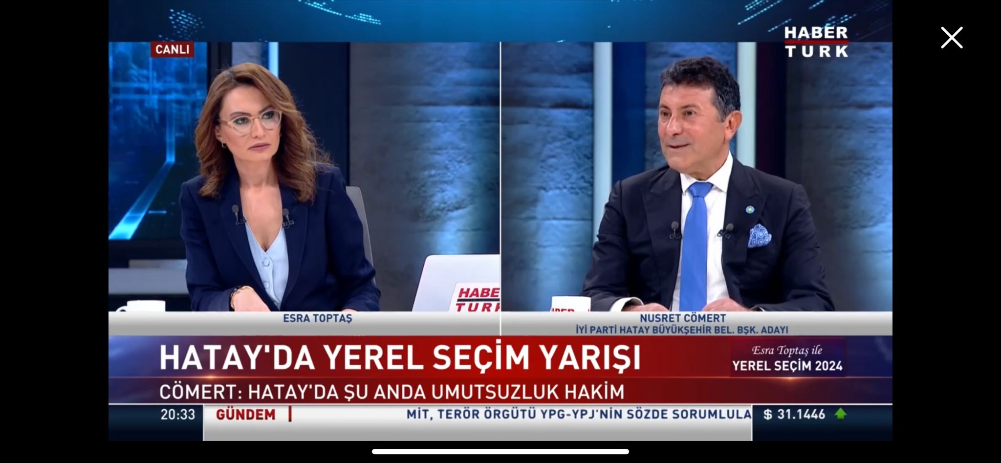 Habertürk Yerel Seçim 2024 programında canlı yayın konuğu olan İYİ Parti Hatay Büyükşehir Belediye Başkan Adayı Nusret Cömert, deprem felaketinde büyük yıkımların yaşandığı Hatay’ın yeniden inşası için oluşturduğu vizyonu ve yapacağı çalışmaları anlattı.
