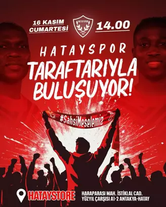 Hatayspor, milli maç arasında cumartesi günü saat 14.00’te Antakya 100. Yıl Çarşısı’nda bulunan Hataystore mağazasında taraftarlarıyla bir araya gelecek.