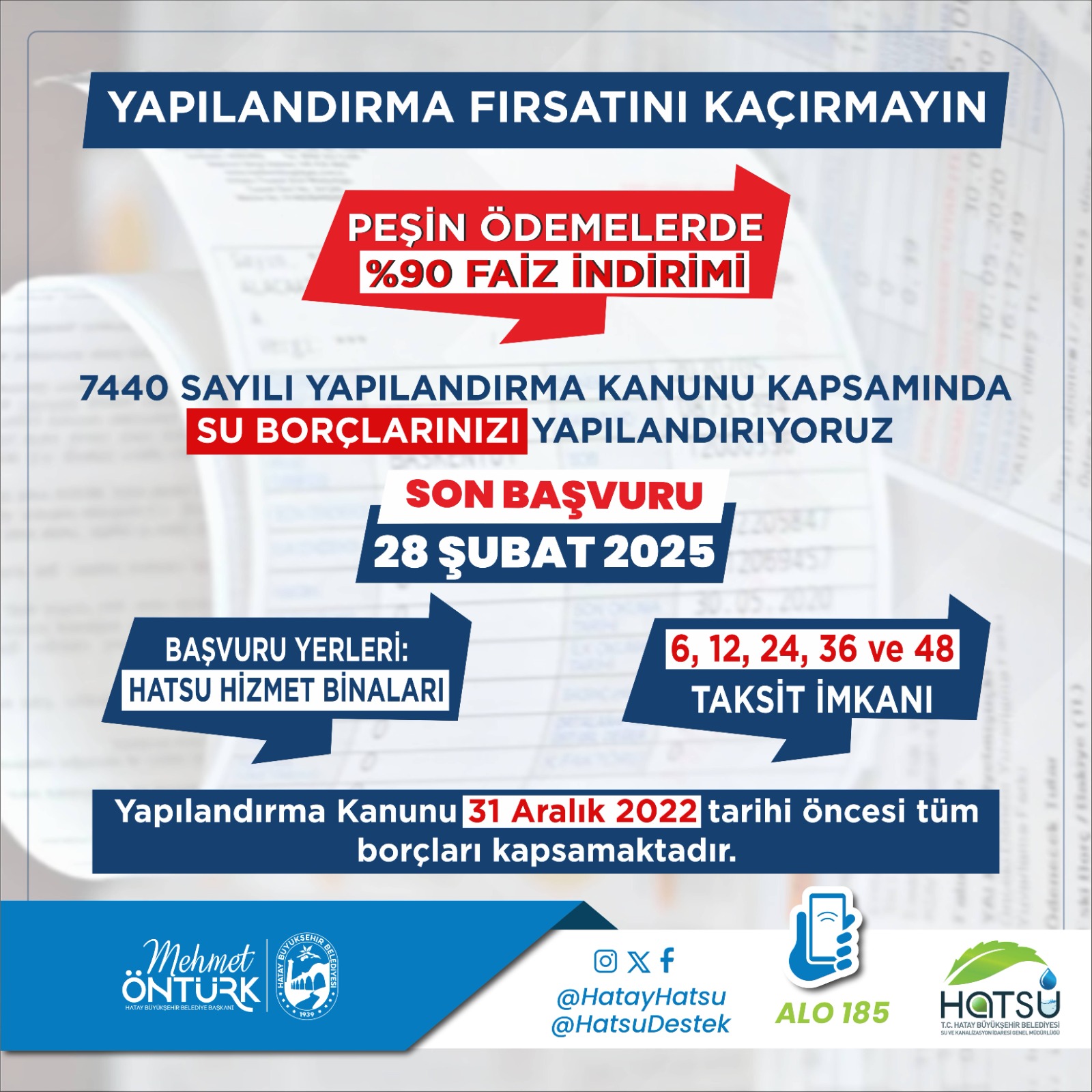 Hatay Büyükşehir Belediyesi Su ve Kanalizasyon İdaresi Genel Müdürlüğü (HATSU), 31 Aralık 2022 (Bu tarih dahil) öncesi yapılandırma ve 31 Aralık 2022 sonrası su borcu olan abonelerin taksitlendirme başvurusunda bulunabileceğini duyurdu.