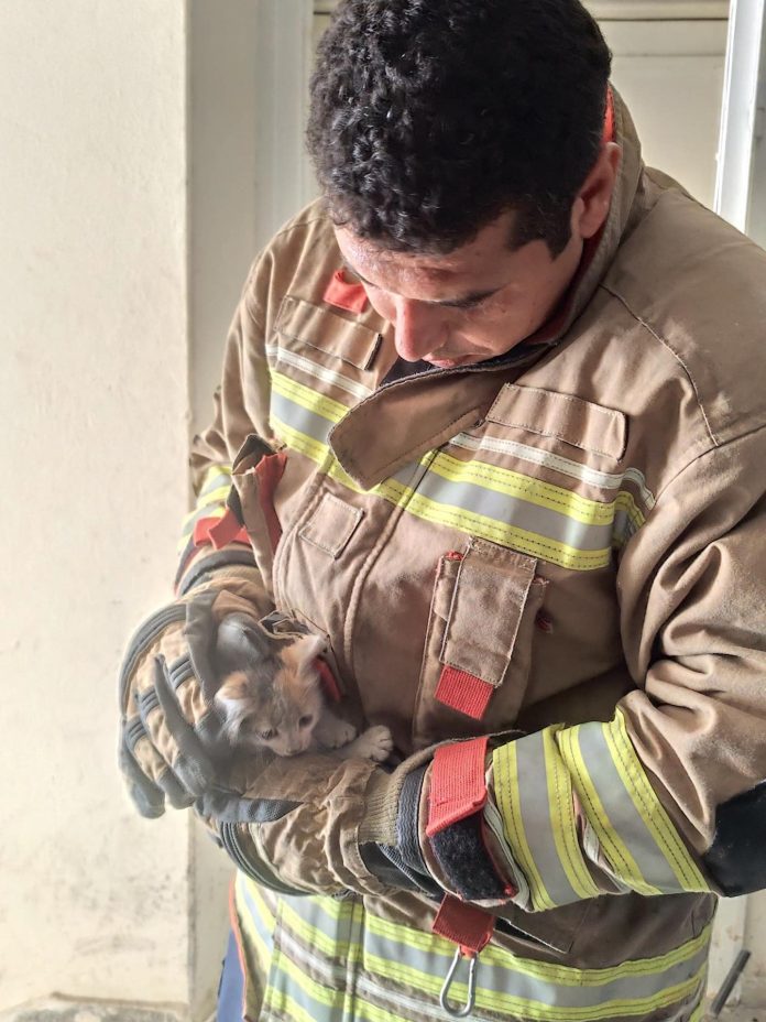 Hatay’da havalandırma boşluğuna düşerek mahsur kalan yavru kediyi itfaiye ekipleri kurtardı.