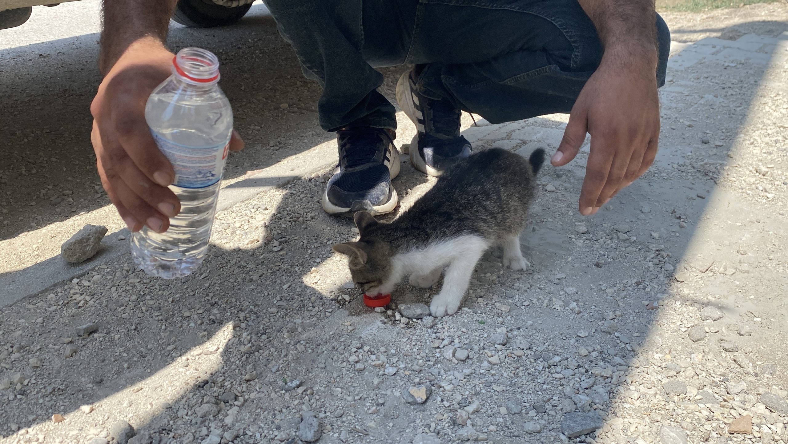 Olay, Antakya ilçesine bağlı Akasya Mahallesi’nde meydana geldi. İş için bulunduğu mahallede yürüyen Abdullah Küçük, çevreden gelen miyavlama sesini fark etti. Sesin geldiği yöne giden Küçük, yavru bir kedinin ağaçta mahsur kaldığını gördü. Kediyi kurtarmak için harekete geçerek ağaca tırmanan Küçük, yavru kediyi hızlı bir şekilde mahsur kaldığı yerden indirdi. Herhangi bir yara almadığı belirlenen kedinin susuz kaldığını fark eden Küçük, şişe kapağına koyduğu suyu içirdi.