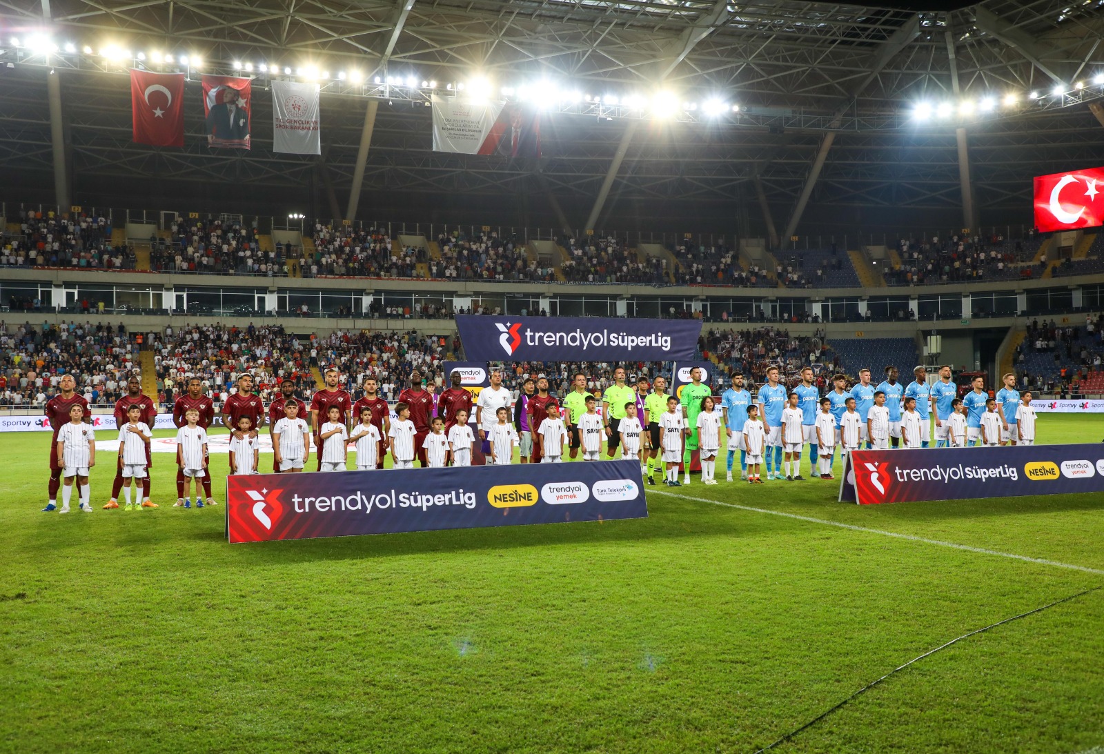 Küçük sporseverler, hakem ve bordo beyazlı takımın futbolcularıyla bir araya gelerek maç öncesinde gerçekleştirilen seremoniye de katıldı.