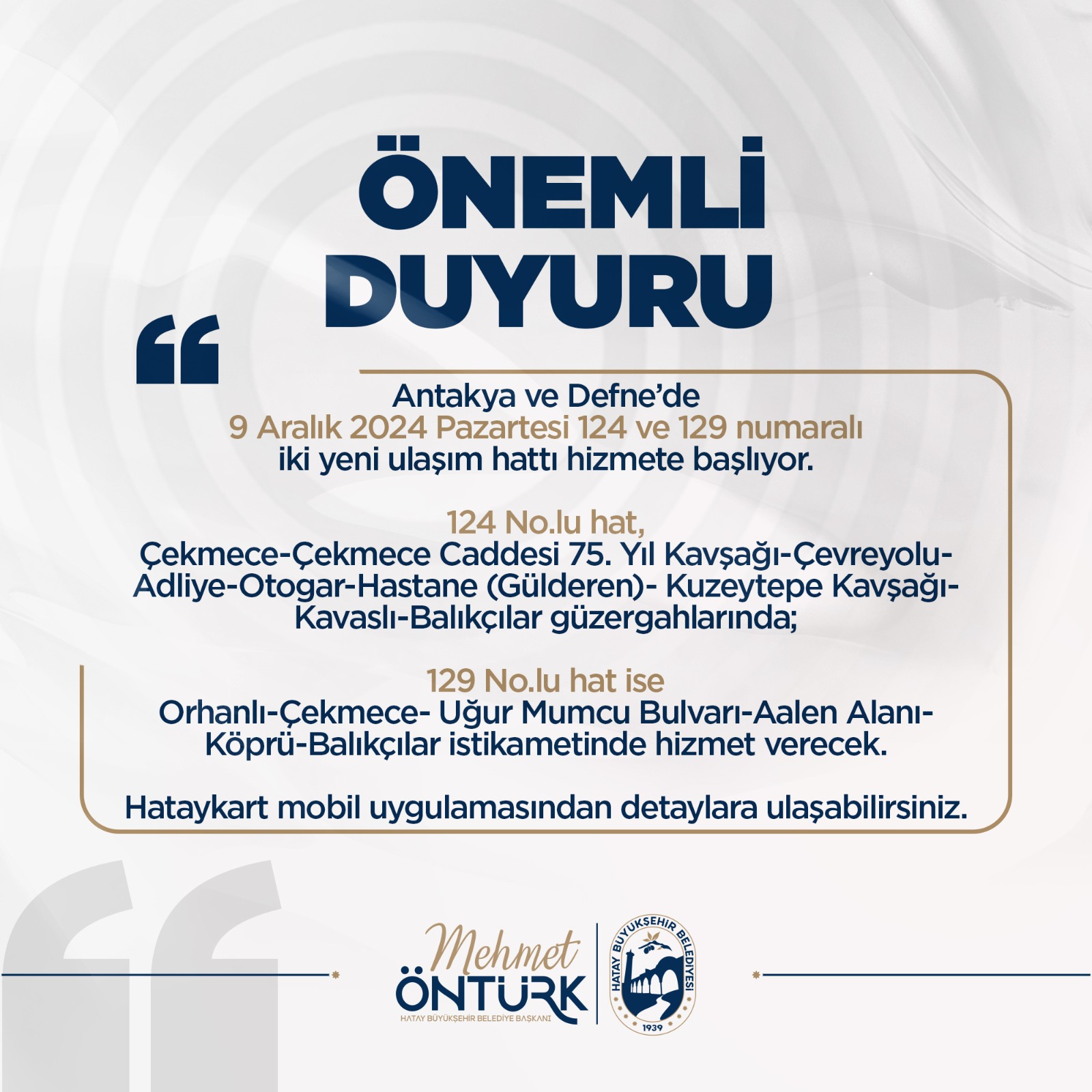 Hatay Büyükşehir Belediyesi (HBB), şehir içi ulaşımda kolaylık sağlamak amacıyla Antakya ve Defne’de 124 ve 129 numaralı yeni iki hat açacağını duyurdu.
