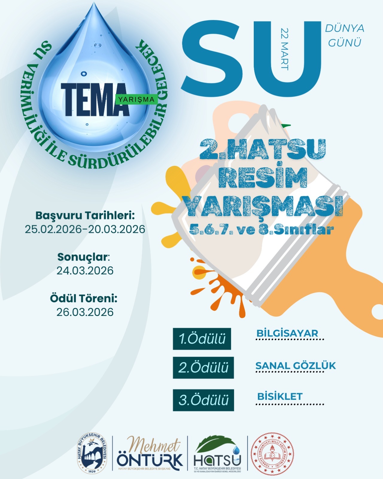 HATSU, su kaynaklarının korunması, su tasarrufunun yaygınlaştırılması ve bilinçli su kullanımının teşvik edilmesi amacıyla Hatay genelinde öğrenim gören ortaokul öğrencilerine yönelik “Su Verimliliği ile Sürdürülebilir Gelecek” temalı resim yarışması düzenliyor.