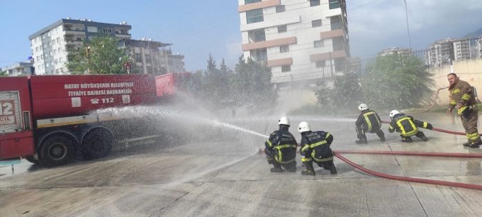 İskenderun İtfaiyesi’nde verilen eğitim sonrasında uygun bir alanda tatbikat gerçekleştiren itfaiye ekipleri, yangına anında yapılması gerekenler ve yangın söndürme cihazlarının kullanımı hakkında tatbikata katılan üyeleri uygulamalı olarak bilgilendirdi.