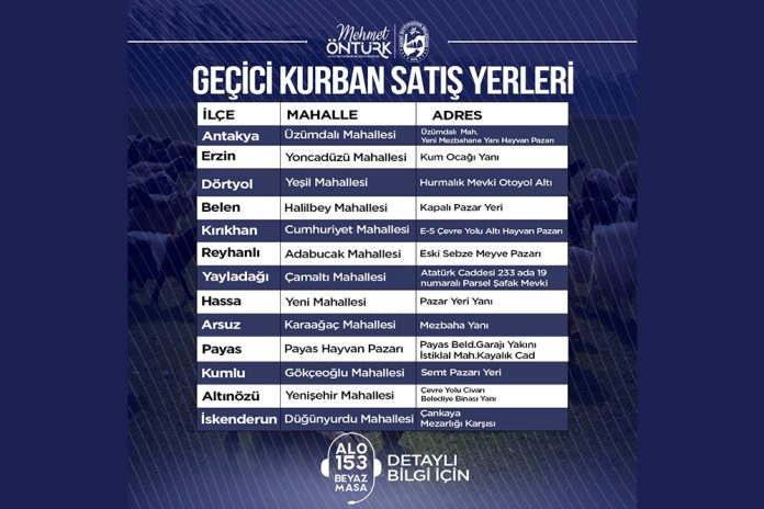 Hatay Büyükşehir Belediyesi (HBB), Kurban Bayramı’nda kurban ibadetlerini gerçekleştirmek isteyen vatandaşların küçük ve büyükbaş hayvan satış noktalarını açıkladı.